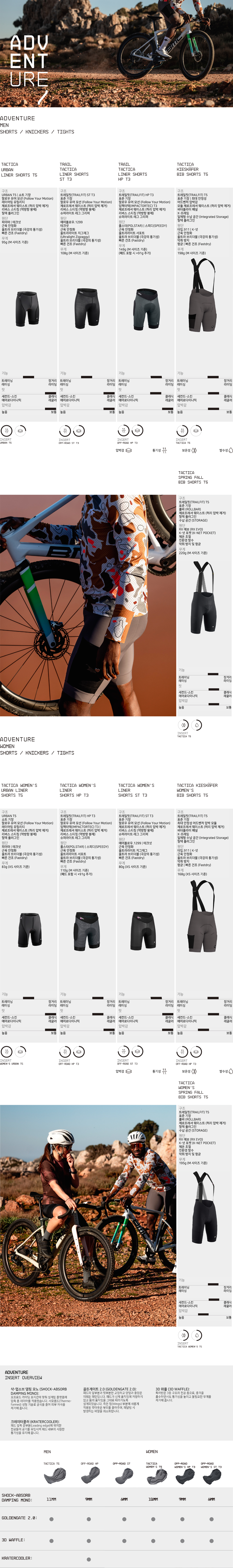 이번 업그레이드의 핵심은 Type.911 소재와 rollBar(롤바) 안정화 구조입니다. 이는 레이싱 시리즈에서 차용된 기술로, 고강도 로드 퍼포먼스를 오프로드 환경에 그대로 이식했습니다. 또한, 허벅지 포켓의 크기를 키워 라이딩 필수품과 보급식을 더 쉽고 넉넉하게 수납할 수 있도록 개선했습니다. T5 세대에 들어서는 인서트(패드) 또한 더 우수한 충격 흡수 폼으로 업데이트하여, 그래블과 거친 트레일에서 발생하는 반복적인 충격과 진동을 효과적으로 상쇄해 줍니다.